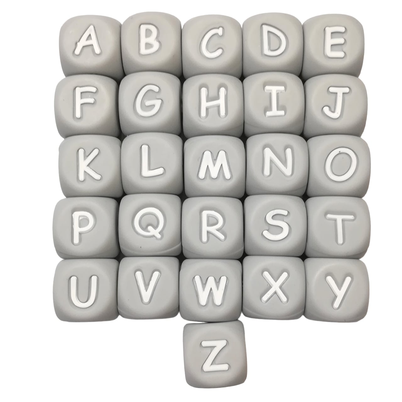 Je 1 Buchstabe   |   hellgrau mit weißen, geprägten Buchstaben   |   12 x 12 mm, Fädelloch ca. 2 mm   |   Material: Silikon
