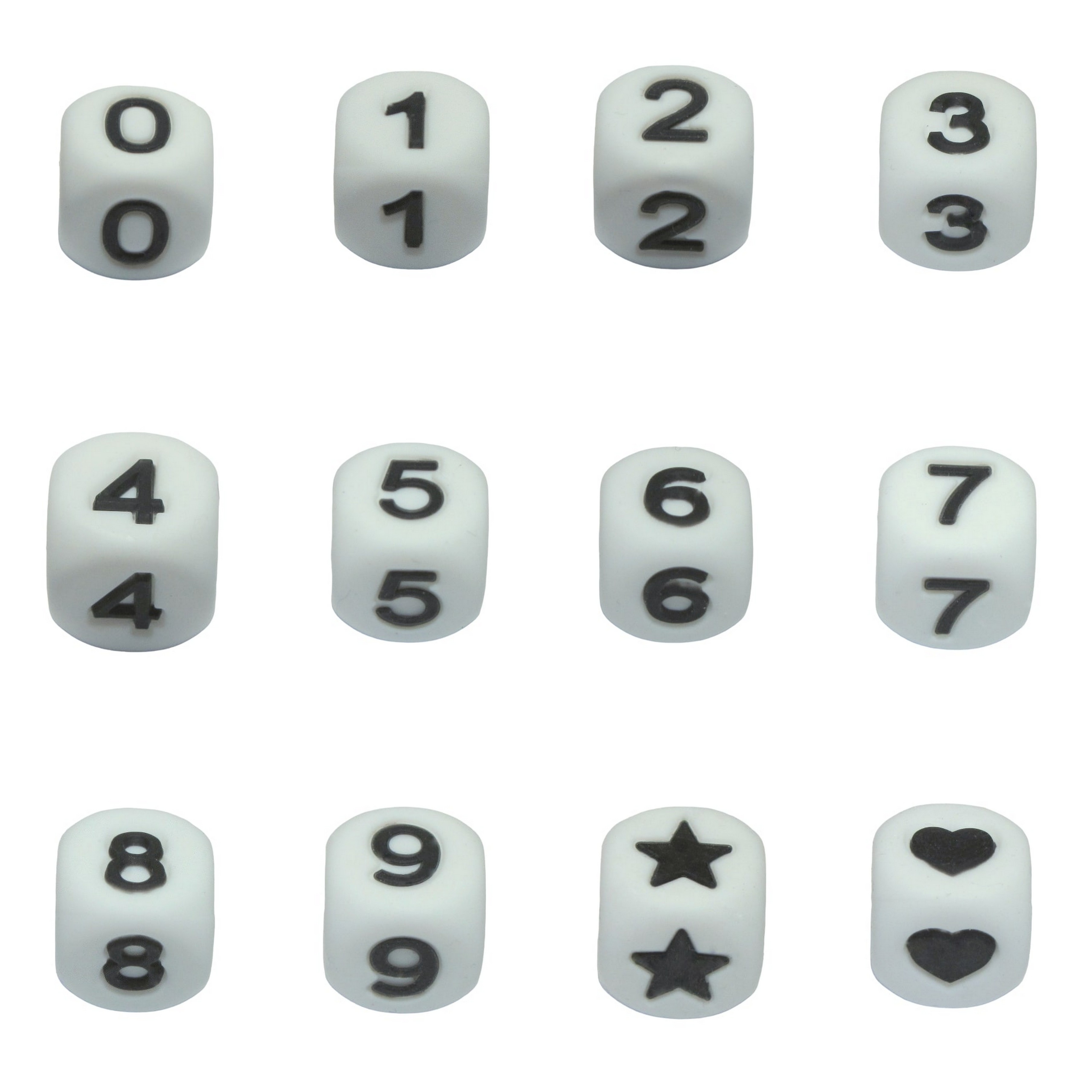 Je 1 Zahl | weiß mit schwarzen, geprägten Zahlen | 12 x 12 mm, Fädelloch ca. 2 mm | Material: Silikon