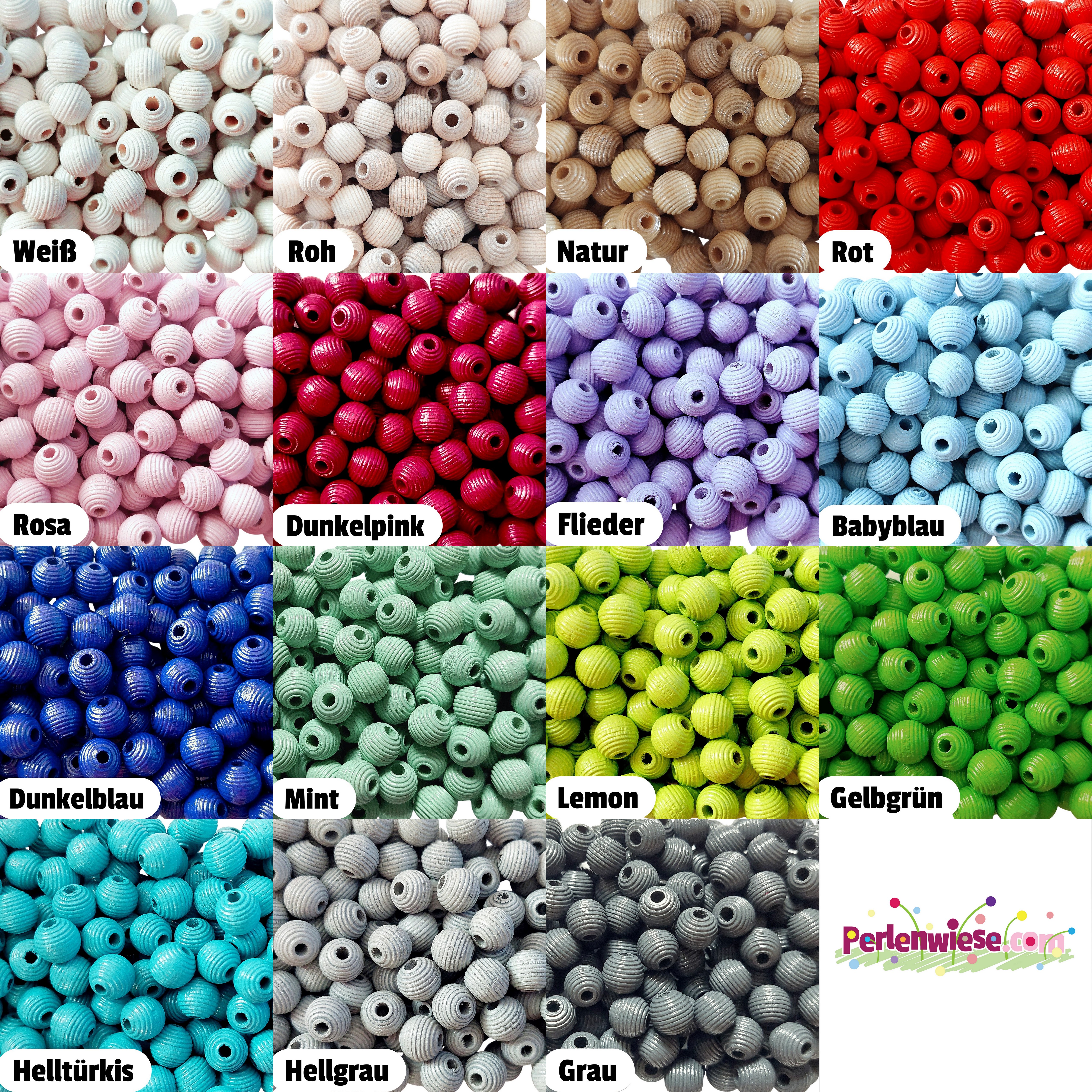 1 Päckchen = ca. 30 Stk.   |   Ø ca. 10 mm, Bohrung ca. 3 mm   |   Auffädellänge eines Päckchens ca. 31 cm   |   mit Querrillen   |   Material: Ahornholz