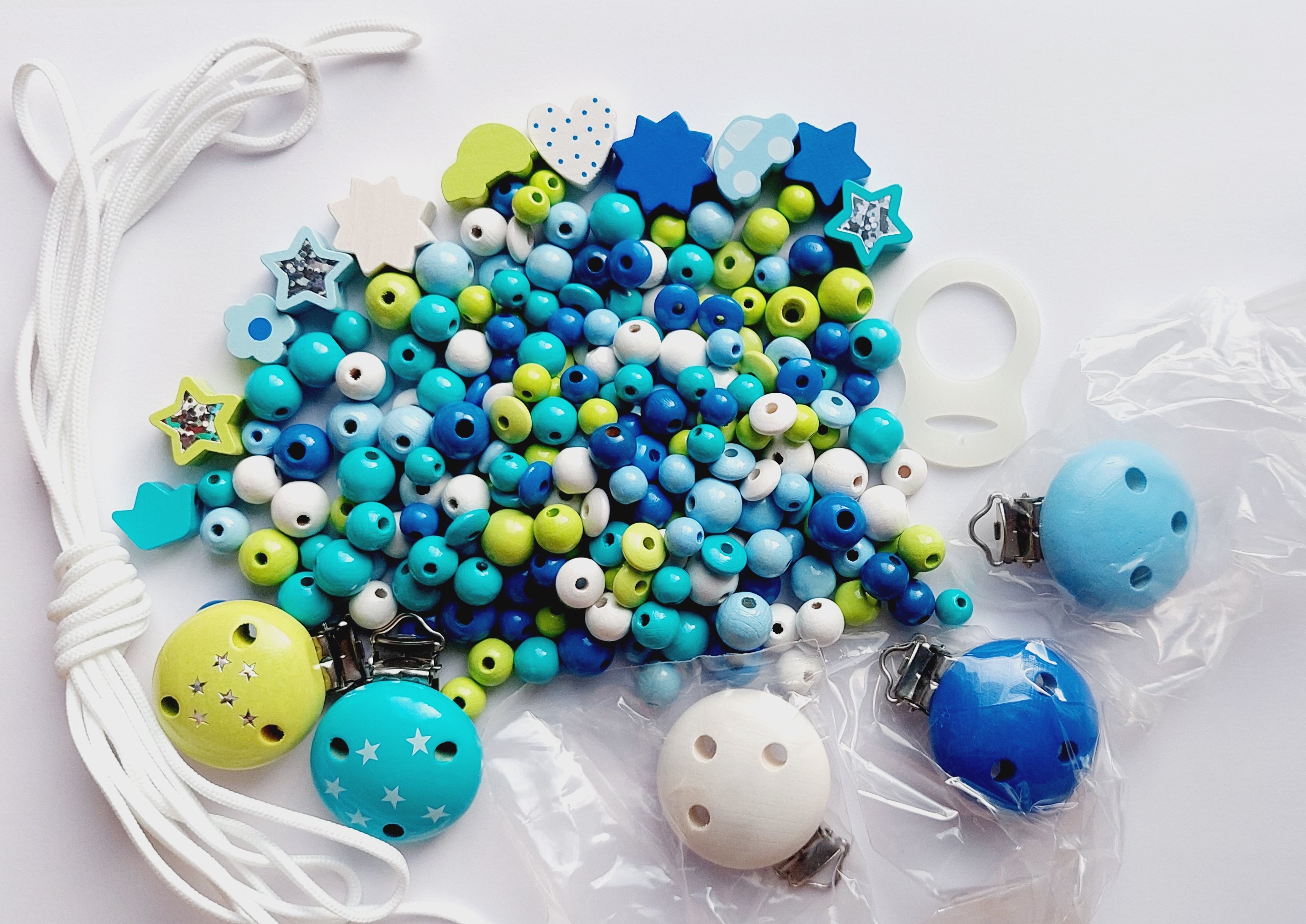 Das Bastelset eignet sich zur Herstellung von z.B. Schnullerketten, Greiflingen, Kinderwagenketten, Schlüsselanhängern, Namensketten, Beißketten...